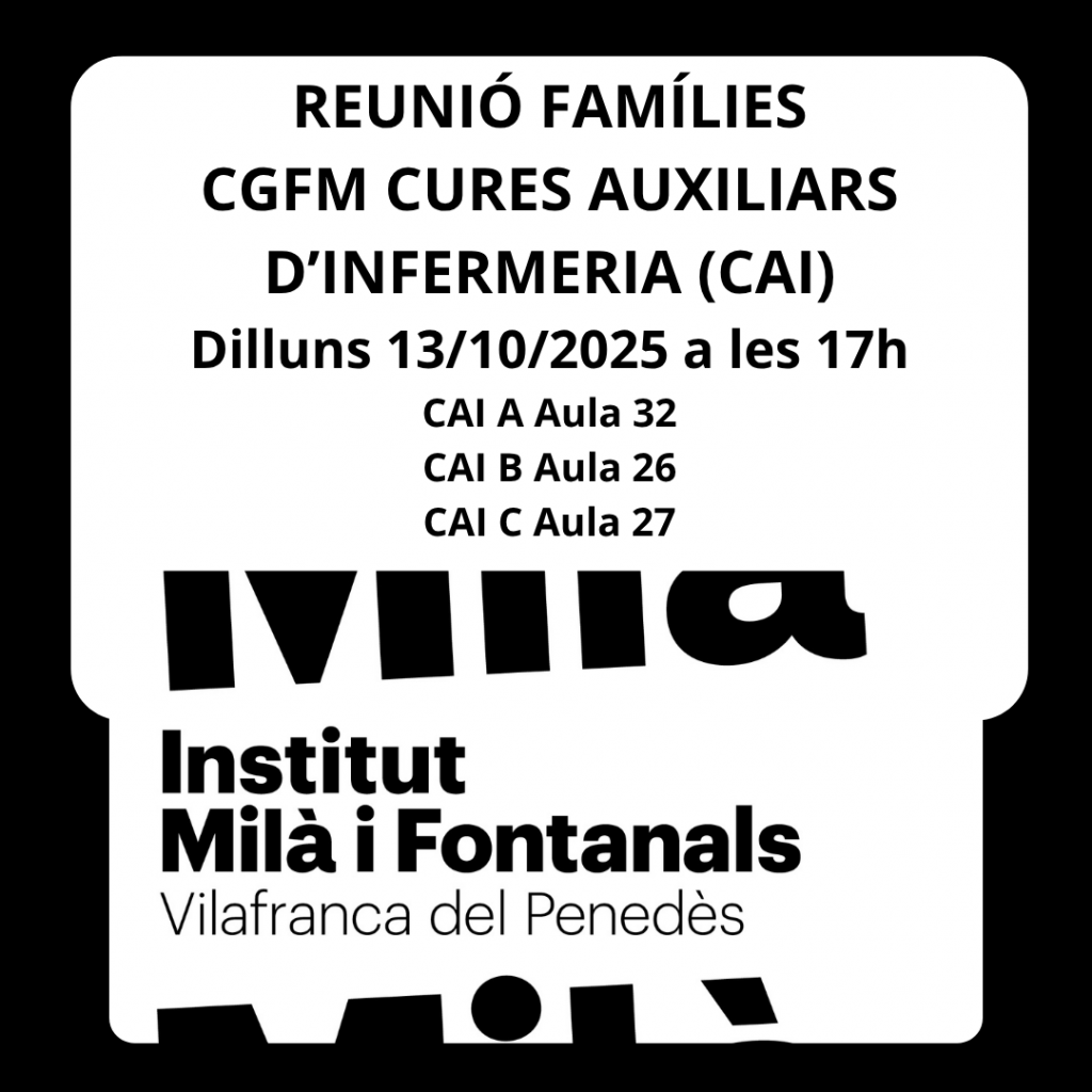 El dilluns 13/10/2025 Reunió amb les famílies del cicle formatiu de grau mitjà CFGM Cures Auxiliars d’Infermeria (CAI) a les 17h a l’Institut Milà i Fontanals, amb l’equip docent del Departament de Sanitat.